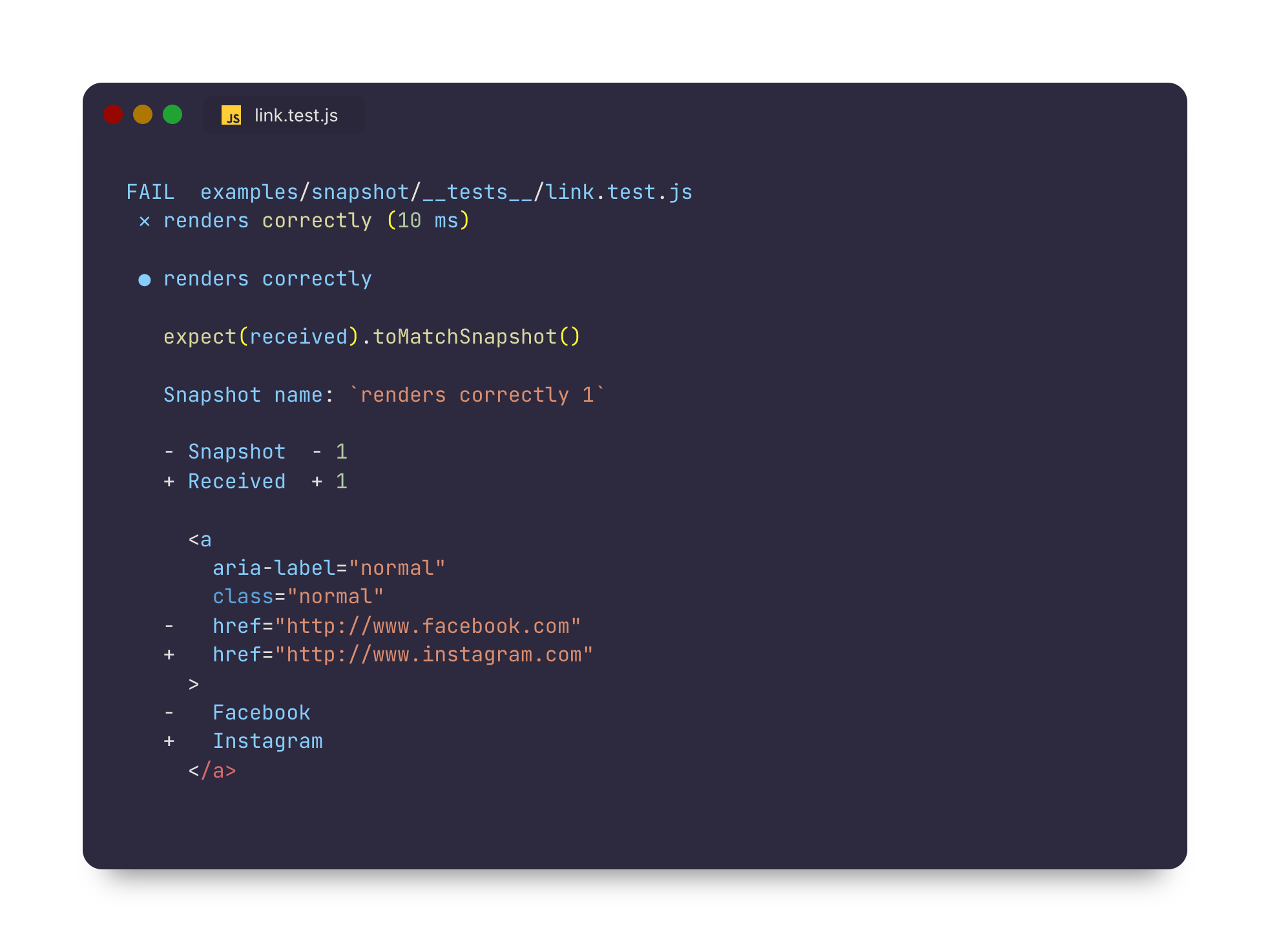 El artefacto de instantánea debe confirmarse junto con los cambios de código y revisarse como parte de tu proceso de revisión de código. Jest usa pretty-format para hacer las instantáneas legibles durante la revisión de código. En ejecuciones posteriores de la prueba, Jest comparará la salida renderizada con la instantánea anterior. Si coinciden, la prueba pasará. Si no coinciden, o el ejecutor de pruebas encontró un error en tu código (en este caso, en el componente <Link>) que debe corregirse, o la implementación ha cambiado y la instantánea necesita actualizarse.